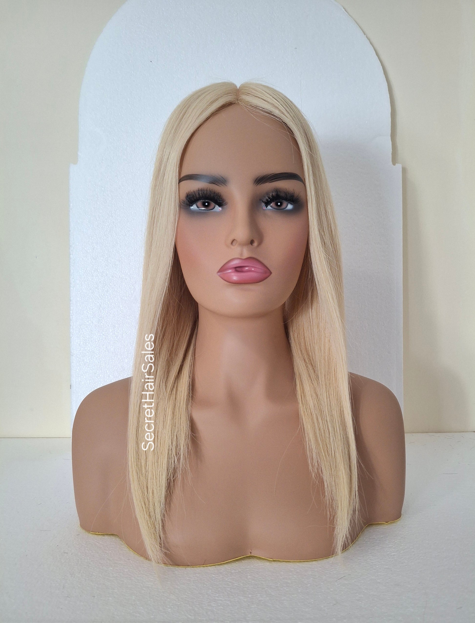 Bella lace front silk and weft base topper, 100% human hair, 6x7inch base, 16inches long, sunshine blonde